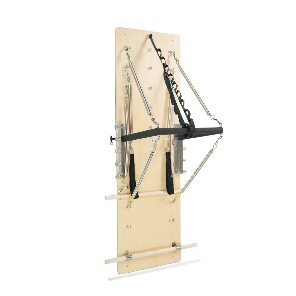 Sinya Wall Board to elegancka i wszechstronna stacja treningowa, która pozwala na wykonanie niezliczonej liczby ćwiczeń przy zachowaniu kompaktowych wymiarów. Dzięki solidnej konstrukcji z drewna i aluminium oraz systemowi sprężyn o różnych oporach, urządzenie idealnie sprawdzi się zarówno w profesjonalnym studiu Pilates, jak i w domowej przestrzeni treningowej.